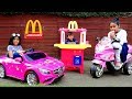 Join little girls Nadia and Amani ordering food at McDonald's Drive Thru pretend play kids kitchen playset. What food do they order?